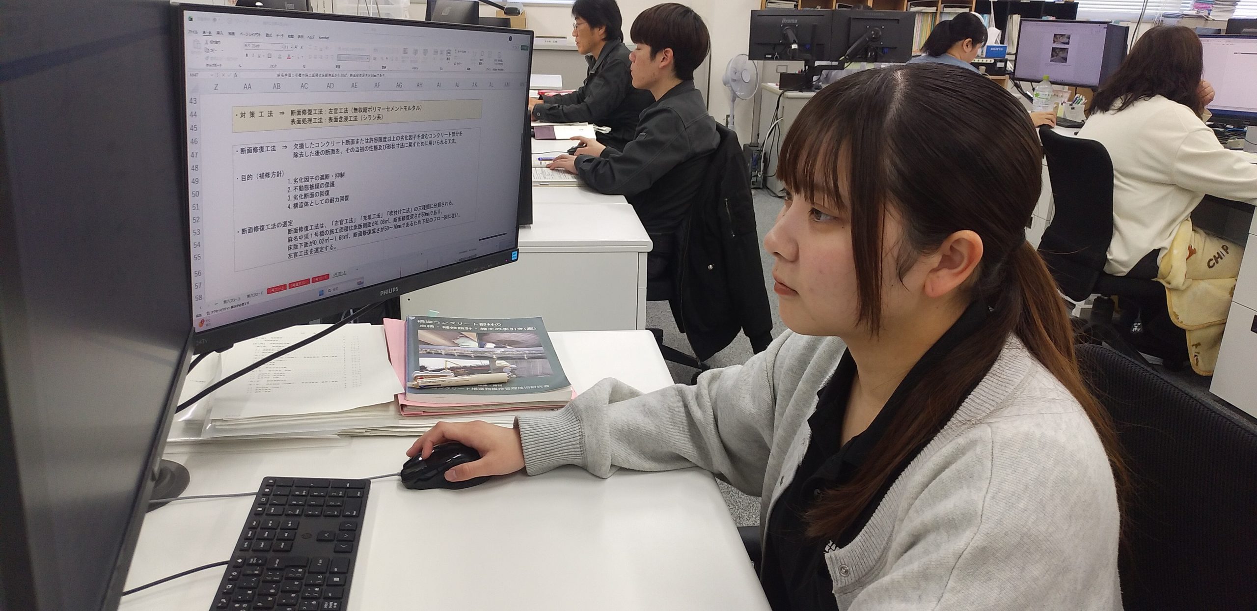 土木コンサルタントは男性が多いイメージで少し不安でしたが、環境防災はえるぼしに認定されており、女性も活躍できる環境だったので安心して働くことができています。仕事をする中で土木コンサルタントは多種多様な仕事があり、日々学んでいくことが大切な仕事だとこの2年間で感じました。